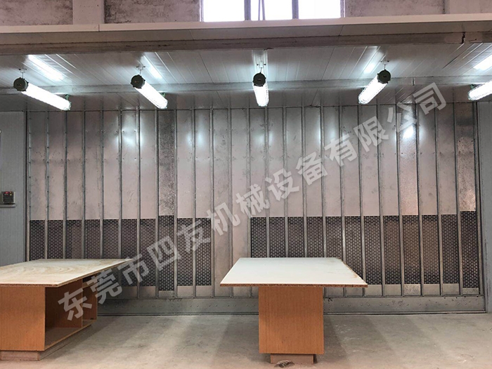 噴漆時(shí),外部空氣經(jīng)過初級(jí)過濾網(wǎng)過濾后由風(fēng)機(jī)送到房頂,再經(jīng)過頂部過濾網(wǎng)二次過濾凈化后進(jìn)入房?jī)?nèi)。房?jī)?nèi)空氣選用全降式,以0.2-0.3m/s的速度向下流動(dòng),使噴漆后的漆霧微粒不能在空氣中逗留,而直接經(jīng)過底部出風(fēng)口被排出房外。這樣不斷地循環(huán)轉(zhuǎn)換,使噴漆時(shí)房?jī)?nèi)空氣清潔度達(dá)98%以上,且送入的空氣具有一定的壓力,可在車的四周構(gòu)成一恒定的氣流以去除過量的油漆,從而zui大極限地確保噴漆的質(zhì)量。家具出產(chǎn)中廣泛選用噴涂工藝對(duì)家具進(jìn)行涂飾,選用噴涂工藝出產(chǎn)效率高,所構(gòu)成的漆膜均勻細(xì)膩、平坦光滑、附著力高。但在噴涂施工時(shí)被高壓空氣所霧化的涂料,構(gòu)成了大量的漆霧。漆霧是由涂料微粒和溶劑組成,漆霧比重很小,漂浮在空氣中。漆霧沉降在工件表面會(huì)影響工件的質(zhì)量,操作人員吸入漆霧也危害身體健康。